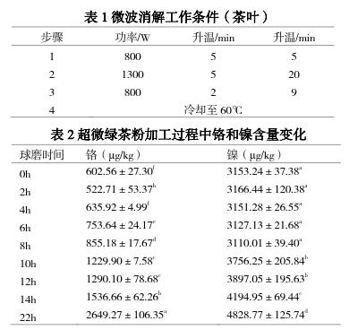 對不同球磨時(shí)間的超微綠茶粉進(jìn)行了重金屬元素鉛、鉻及鎳的測定;設(shè)置不同材質(zhì)的磨球和罐體對蒸青片進(jìn)行球磨,并選取球磨材料不同、粒徑相近的兩組超微綠茶粉進(jìn)行重金屬元素(鎳、鉻)檢測,為尋求合適的球磨材料提供依據(jù)。結(jié)果顯示:隨著球磨時(shí)間的增加,茶樣中的鉻和鎳含量均呈上升趨勢,而鉛含量無顯著差異,原因是球磨時(shí)所用罐體為不銹鋼材質(zhì),而不銹鋼中含有 18.0~20.0%的鉻,8.0~11.0%的鎳;在不銹鋼球-不銹鋼罐、