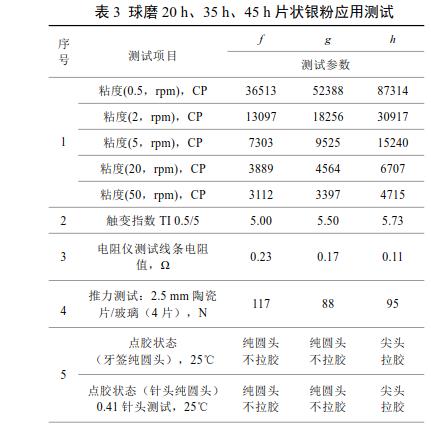 由表3可知,球磨20h、35h片狀銀粉制得IC封裝導(dǎo)電銀膠點膠效果好,無明顯拉膠現(xiàn)象;45h的制得導(dǎo)電銀漿點膠存在尖頭和拉膠現(xiàn)象。同時可以看出,20h的片狀銀粉觸變指數(shù)低,導(dǎo)電銀膠需要有良好觸變特性便于點膠;45h的片狀銀粉觸變指數(shù)高;而且可以看出35h、45h制得的導(dǎo)電膠的線條電阻值較小。這三款產(chǎn)品推力測試、固化后硬度測試、高低溫冷熱沖擊測試及高溫高濕測試均滿足應(yīng)用。綜合上述各項指標,球磨35h制得的片狀銀粉制得的導(dǎo)電銀膠均達到了應(yīng)用指標要求。